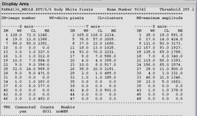 13. Liitä DD-kaapelit uudelleen Pen Walliin. Irrota Body and Head T/R Bias BNC -kaapeli SSM.EPT:n valkoisen pikselin pään ja kehon skannauksessa. Tuloksena on, että kaikki epäonnistui. Liitä takaisin rungon ja pään esijännityskaapelit poistettu. Irrota pään ja rungon lähtökaapeli SRFDII.EPT:n valkoisen pikselin skannauksen yhteydessä. Tuloksena on, että kaikki epäonnistui. Vahvisti, että ongelma ei ole SRFDII AMP:ssä ja SSM:ssä.