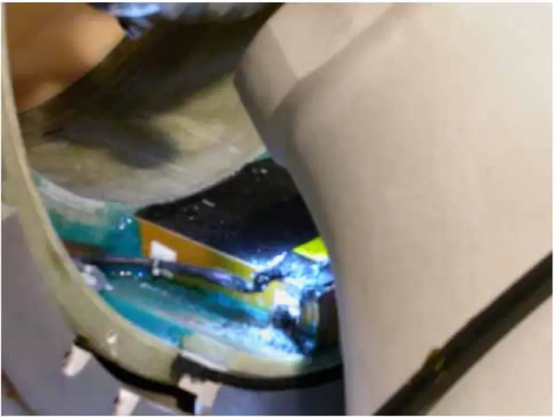 Ylläolevasta toiminnasta ja analyysistä päättelemme, että ongelman pitäisi johtua gradienttikelasta. Joten poistamme magneetin etu- ja takakannen, tarkistamme ja kiristämme gradienttikelaan liittyvät pultit. Magneetin takakannen irrotuksen jälkeen huomaamme, että korkealuokkainen välilevyn kaapeli on palanut mustaksi.